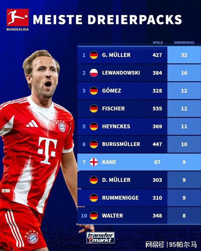 对标姆巴佩,参照梅西,32岁的凯恩并没有辜负“大英帝星”的头衔,以至于两届德甲金靴的履历并不能完全匹配星光,或者说他在德甲真正意义上实现了降维打击。比如他只用了67场比赛就完成了9次帽子戏法,他只用了104场就完成拜仁百球里程碑,并成为21世纪最快为五大联赛俱乐部打进百球的球员。或许有人用“大树底下好乘凉”的观点淡化凯恩的进球效应,但作为欧冠历史上进球最多的英格兰球员,效力拜仁期间的凯恩也曾给皇马、国米、切尔西等豪门上过课。