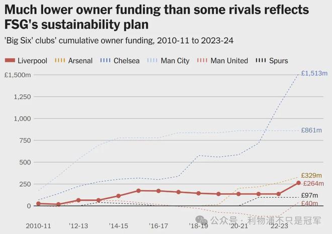 图表:远低于部分竞争对手的所有者注资反映了 FSG 的可持续计划。自 FSG 在 2010-11 赛季初收购利物浦以来,'Big Six' 俱乐部所有者注资的折线图,其中利物浦的 2.64 亿英镑低于其他三家,并显著低于切尔西和曼城。注:所有者注资包括以股权或贷款形式注入的现金,减去任何贷款偿还、支付的股息或其他提取性措施(例如股票回购)。利物浦所面临的——托特纳姆热刺也处于类似境地——是那些拥有更多现金储备可调用的俱乐部。在另一个时代,克洛普可能已经赢得了五次英超冠军,但在曼城面前,他遇到了一个非凡的经理(佩普·瓜迪奥拉),一支非凡的球队,同时也是一支异常昂贵的球队。利物浦在工资上花费不少,但在转会费上远不及曼城,直到今年夏天。查看我们现有的最新账目,并包括摊销(转会费按年度分摊计入费用的方式),在"Big Six"中,利物浦排在第六位,而且差距不小。他们比热刺少2000万英镑,比曼城少5000万英镑,比切尔西少约9000万英镑。这并不是说利物浦没有花钱,而是他们在犯错方面的容错空间更小。【球迷关系】当比尔·香克利在1959年上任后将利物浦从二级联赛的挣扎者变成英格兰冠军后,他的一句名言是关于董事会角色的。"在足球俱乐部,有一个神圣的三位一体——球员、经理和支持者,"他说。"董事们不参与其中。他们只是在那里签支票。"这个想法继续影响着利物浦的球迷群体,尤其是在当地。FSG 之前的失败引发了对所有者的执着关注,尽管现在该集团被认为具有巨大影响力,但它并不被爱戴——即使对其工作成果存在尊重。领导利物浦的挑战被视为一种公民责任,但在外国所有者的时代,人们理解这种关系是交易性的。这些相互矛盾的现实意味着 FSG 的高管们永远不能认为自己已经搞定了。FSG 帮助赢得了两次英超冠军,并承诺了前所未有的资金用于转会,但利物浦的历史是建立在统治英格兰足球的基础上的。FSG 还没有达到那个程度。没有人能指责 FSG 试图快速赚钱。是的,它也曾让自己难堪,在试图利用利物浦的成功资本化时做出了错误的决定,导致了信任问题。2016年提议引入77英镑的门票,导致1万名球迷在对阵桑德兰的比赛中离场;试图注册商标"Liverpool"的计划流产;以及对失败的欧洲超级联赛项目的热情支持,这引发了更多抗议和亨利的卑躬屈膝的道歉。然而,尽管有这些失误,FSG 也证明了自己是利物浦负责任的财务所有者。有些人可能声称这是一个低标准,但这忽略了希克斯和吉列特的毁灭性统治。当 FSG 出现时,利物浦本可能遇到更像曼联的格雷泽家族那样的所有者,后者基本上坐视其杠杆收购的资产累积债务。FSG 开发了设施,包括安菲尔德和训练场。俱乐部已经转型,并且更接近实现其潜力。现在的问题是:FSG 愿意把它带到多远?【未来】三年前,FSG 曾短暂考虑过出售的可能性,然后选择将一小部分少数股权出售给 Dynasty。现在,出售这项资产——其价值已从2010年的约3亿英镑增长到超过40亿英镑——远非他们的考虑。接近所有者的消息人士坚称,他们正计划长期持有利物浦,将其作为其投资组合的一部分。没有迹象表明亨利或维尔纳的兴趣在减弱。两人都在五月份冒着风雨加入了斯洛特教练的球队,参加了庆祝英超冠军的敞篷巴士游行。当超过一百万支持者挤满城市街道时,维尔纳告诉工作人员,他从未见过这样的场面,并认为俱乐部与其球迷群体之间的纽带在职业体育界是独一无二的。FSG 希望增加奖杯收藏,目前包括两次英超联赛冠军、一次欧冠冠军、一次世俱杯冠军、一次足总杯冠军和三次联赛杯冠军。它也仍然致力于在欧洲购买第二家足球俱乐部,认为这可以帮助利物浦招募和培养年轻球员。这也是在2024年3月吸引爱德华兹回归的关键因素。人们一直承认,这需要等待合适的机会,而不是仓促行事。沃德在过去18个月里花了很多时间评估购买特定俱乐部的足球价值。然后他的建议会提交给 FSG 董事会成员,由他们根据财务意义来决定是否批准。去年经过一段时间的尽职调查后,决定不购买法国俱乐部波尔多。自那以后,西班牙俱乐部如马拉加和赫塔菲受到了认真考虑。《The Athletic》在7月透露,曾与赫塔菲主席安赫尔·托雷斯就分阶段收购进行过讨论。然而,托雷斯表示,他计划在2028年前保留控制权,以兑现他翻新体育场的承诺。FSG 最伟大的成就之一就是安菲尔德的重建。这是他们接手时面临的最大问题之一,但重建主看台和安菲尔德路看台将容量从44,000人提升到61,000人。一个标志性的场馆在保留其历史和传统的同时实现了现代化。当你考虑到新建训练中心、回购并翻新原来的梅尔伍德基地供女队使用,以及在安菲尔德的新俱乐部商店时,已投入近3亿英镑用于俱乐部的基础设施建设。《The Athletic》上月透露,FSG 还承诺投入2000万英镑对青训学院进行全面改造。鉴于附近房屋带来的挑战,进一步扩展安菲尔德的容量被认为是不现实的。然而,在商业上,人们相信利物浦仍有很大的扩张空间。本周,利物浦在中国深圳开设了第22家独立零售店——没有其他足球俱乐部或美国主要体育特许经营商拥有比这更大的全球网络。与阿迪达斯的新球衣协议也带来了创纪录的销售额。俱乐部的合作伙伴团队不断扩大,员工常驻香港、日本、新加坡、波士顿、纽约、伦敦和利物浦。"我们的收入发生了阶跃式变化,但我们仍有很大的增长空