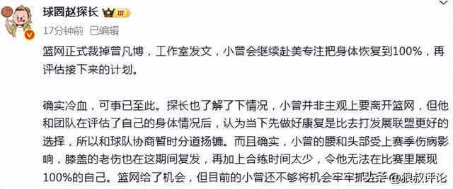 北京时间10月15日,根据篮网队官宣,将会裁掉中国球员曾凡博引发外界的热议。 至此,这名中国球员前锋又一次结束了短暂的赴美追梦旅途。 根据媒体人赵探长的报道,小曾并非主观上要离开篮网,但他和团队在评估了自己的身体情况后,认为当下先做好康复是比去打发展联盟更好的选择,所以和球队协商暂时分道扬镳。而且确实,小曾的腰和头部受上赛季伤病影响,膝盖的老伤也在这期间复发,再加上合练时间太少,令他无法在比赛里展现100%的自己。篮网给了机会,但目前的小曾还不够将机会牢牢抓在手中。可我坚持认为小曾走出去的想法是没错的,上赛季是他表现最好的一个赛季,这个休赛期也是他非常好的机会,他可以打更高级别的比赛。只是现在的结果有些可惜,但“现在”并不能定义他的整个生涯,因为小曾才22岁。曾凡博接下来的计划,是搞定签证后就马上再度赴美,一边康复一边打算,不排除继续留在海外,在更高舞台提高能力。当然我也认为,如果康复完追求留洋不理想,回CBA也是一个值得考虑的选择,北京首钢队已经兵强马壮,这两年是最好的夺冠窗口期。我相信小曾和他的团队,会做出最好的决定。最后,每一名年轻球员都不该停下追逐更高目标的脚步,这个“更高目标”可以是更大的平台、可以是更高的荣誉、可以是更重要的角色,甚至可以是更大的合同。怀揣梦想、脚踏实地,想办法提高人生上限永远没错。 篮网媒体NetsDaily评论道:“曾凡博现在面临一个选择,他可以回到中国,在CBA获得七位数(人民币)的年薪,或者加入(G联盟)长岛篮网队,一年总收入包括奖金在内略超过10万美元。他曾表示希望利用这次机会重新点燃自己的NBA生涯。