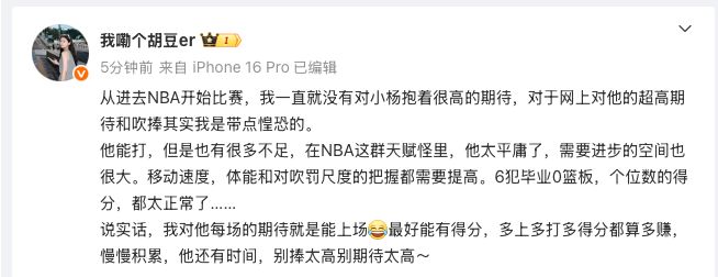 - NBA | 媒体人:杨瀚森还有时间慢慢积累,大家别捧太高、别期待太高