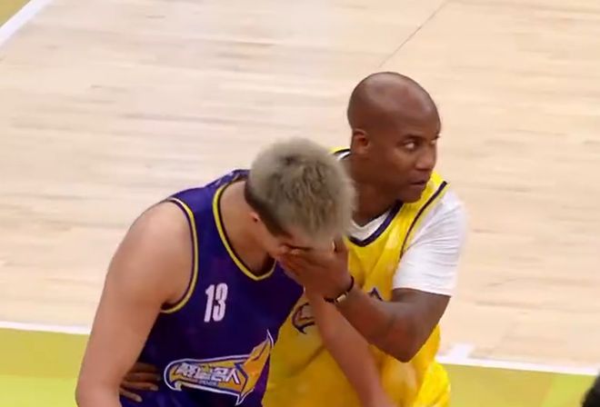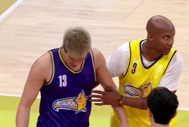 而郭艾伦之所以在聚星名人赛上较劲,我觉得还有另外一个原因,那就是对面站着的是前NBA和CBA双料球星马布里。郭艾伦和马布里是老熟人,应该说也一直相互欣赏。犹记得,马布里曾经公开说过,他认为郭艾伦具备打NBA的实力。不管是不是真心话,但是最起码能证明巅峰期的郭艾伦确实是本土顶级后卫。郭艾伦在此次的聚星名人赛上,也确实和马布里进行了正面交锋,比如说在第四节两队比分交替领先的阶段,正是由郭艾伦带着自己的篮队和马布里的黄队展开对攻。更准确一点来说,其实就是他俩一对一的单挑。在比赛还剩7分21秒时,还发生了马布里的手指不小心戳到郭艾伦的面部的意外情况发生。这下可把郭艾伦给吓得不轻,因为他的眼睛曾被自己广州队的队友给戳伤过,还进行了手术。要是再次被戳伤,麻烦可就大了。万幸的是,并没有伤到郭艾伦的眼睛。