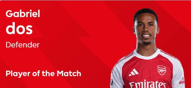 在周日凌晨进行的英超第8轮比赛中,阿森纳客场1-0击败富勒姆,赛后,加布里埃尔当选本场比赛英超官方球迷票选最佳球员。