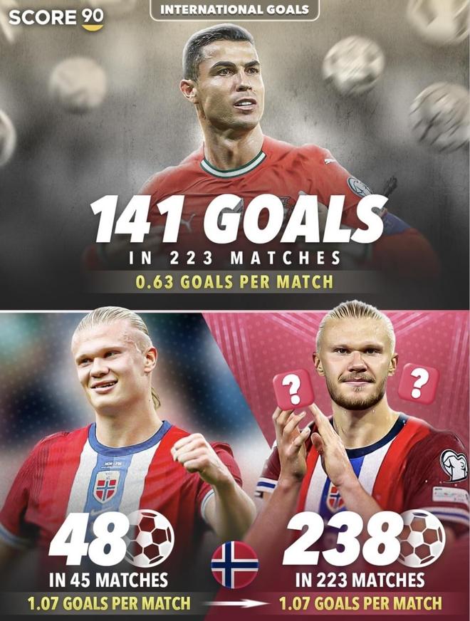 国家队数据C罗:223场 | 141球 |0.63球/场哈兰德:45场 |4 8球 | 1.07球/场(静态外推,仅作参考)若按1.07球/场踢到223场≈238球