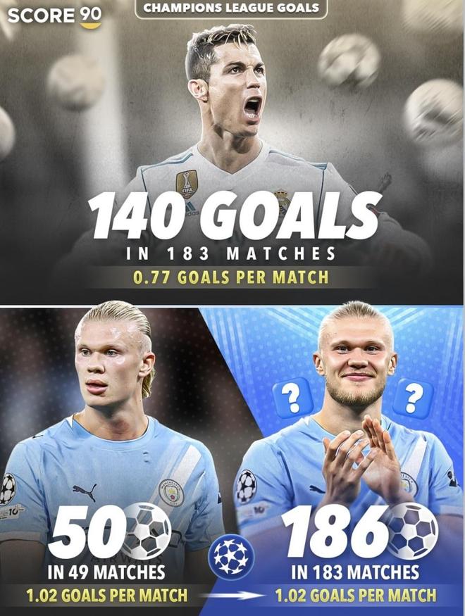 欧冠超C罗只是时间问题C罗纪录将作古哈兰德进球效率势不可挡