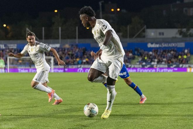昨天巴萨先赛压哨绝杀赢球,暂时超过皇马登顶,皇马今天作客阿方索佩雷斯球场,必须得拿下赫塔菲,才能再超过巴萨夺回榜首。开场后皇马就反客为主展开猛烈攻势,第7分钟,皇马左路快攻,维尼修斯拿球推进精妙直塞,姆巴佩禁区前沿接球突入禁区获得半单刀良机,只不过姆巴佩未能把握机会,大力推射被门将索里亚奋勇扑出。2分钟后皇马几乎一样的进攻,姆巴佩还是禁区前沿接球,晃开回防2人后大力低射,皮球几乎是擦着远端门柱外侧出了底线。