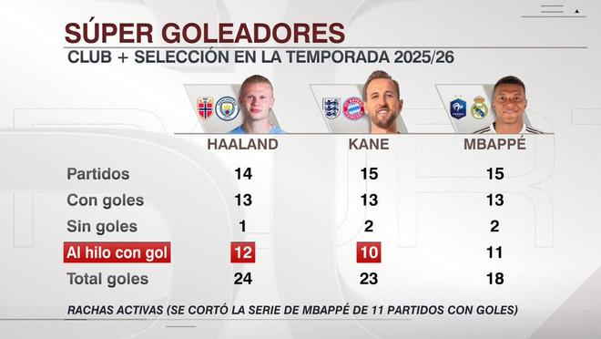 哈兰德、凯恩和姆巴佩是本赛季五大联赛球队中火力全开的三大超级射手。欧冠联赛阶段第三轮,哈兰德和凯恩都斩获进球,哈兰德在俱乐部和国家队已经连续12场比赛取得进球,凯恩则是连续10场俱乐部和英格兰队比赛破门。而姆巴佩本轮欧冠没有进球,连续进球场次停留在11场。【上咪咕独家看英超】