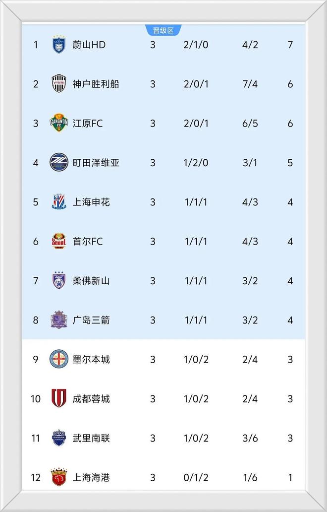 - 中超 | 亚冠精英实时积分榜:申花升至第6跻身晋级区,成都第9,海港垫底