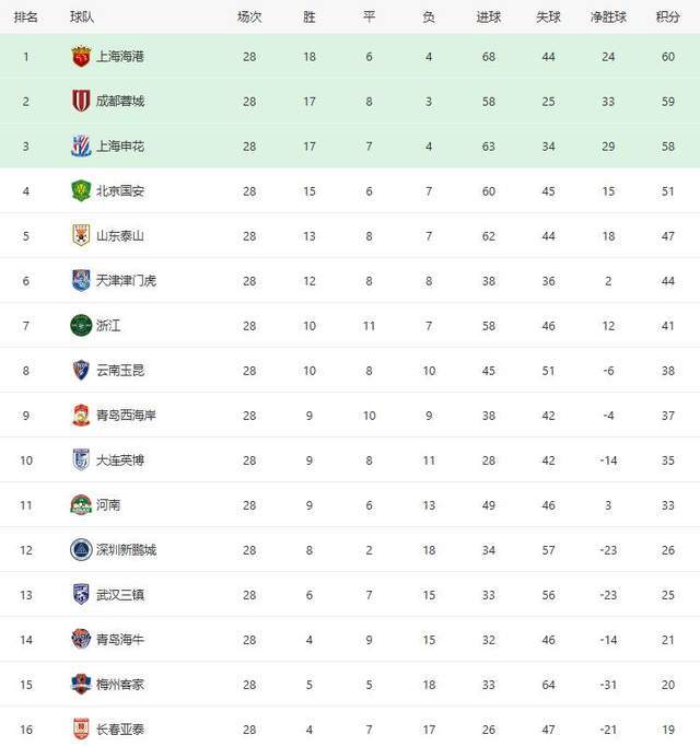 - 中超 | 还剩6分!在没亚冠干扰下海港申花成都谁可以拿完