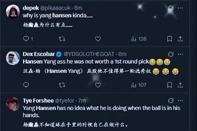 NBA常规赛已经打完了四轮,杨瀚森的出场时间虽然并不多,好在他每场比赛都能获得机会。特别是在和湖人的比赛中,由于这场比赛是开拓者背靠背的比赛,杨瀚森上半场的出场时间就创下了赛季新高。不过可惜的是,杨瀚森的表现比较糟糕,攻防两端都游离在球队之外,而且护框的问题也非常明显。在比赛结束后,先是国外球迷对杨瀚森的表现表达了不满,认为他不知道球在手里的时候该干什么。更有球迷的表现非常直接,认为杨瀚森根本就不值得首轮选秀权。