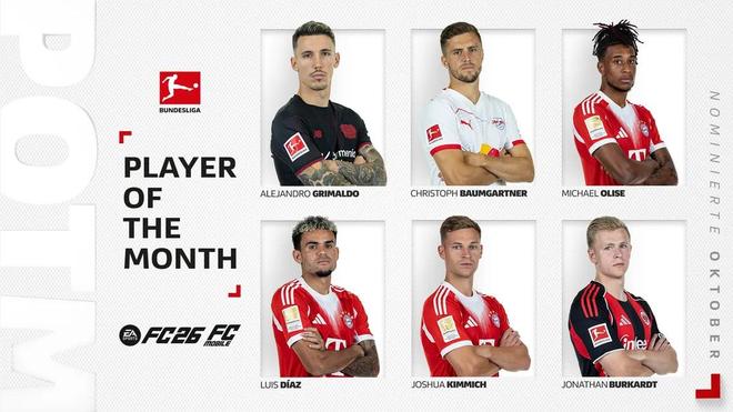 格里马尔多(勒沃库森)格里马尔多在勒沃库森的表现持续出色,他是新赛季唯一一位获得两次月度最佳提名的球员,在10月的第7轮比赛中,他在对阵美因茨的比赛中完成梅开二度,为本赛季第二次。在一周后的比赛以2-0战胜弗赖堡时,他送出一次助攻,这是他本赛季第三次以队长身份出场。他在对阵美因茨和弗赖堡时被评为“场最佳球员,在欧冠和国家队比赛中,他还收获了两次助攻。鲍姆加特纳(莱比锡)鲍姆加特纳对莱比锡上个月攀升至积分榜第二名起到了决定性作用,他在10月对阵多特的比赛、对阵汉堡的胜利以及对阵奥格斯堡的比赛中都有进球,并在对汉堡的比赛中以梅开二度成为全场最佳球员。在对阵奥格斯堡的比赛中,他有一次助攻,在这段时期,没有球员在德甲进球数超过鲍姆加特纳,并且他在每场比赛中至少打入一球,这位奥地利国脚的射门效率为+2.5,是10月全联赛的最佳。奥利塞(拜仁慕尼黑)奥利塞对孔帕尼的重要性在过去一个月尤为明显:他与基米希一样,踢满了每一场正式比赛,在第7轮对阵多特的国家德比中,他打入一球,并在一周后的3-0战胜门兴格拉德巴赫的比赛中送出一记助攻。当奥利塞拿到球时,几乎可以预见对方门将将面临挑战,在10月的联赛中,这位23岁的球员为拜仁创造的射门机会最多(7次),只有一人比他的射门次数更多(8次)。路易斯-迪亚斯(拜仁慕尼黑)路易斯-迪亚斯在拜仁慕尼黑完全融入,在上个月,他在对阵法兰克福的比赛中表现出色,帮助球队以3-0的比分获胜,他贡献了两粒进球和一次助攻,因此毫无悬念地获得了全场最佳球员称号。在欧冠和哥伦比亚国家队的比赛中,迪亚斯也各进一球,迪亚斯也是10月在德甲中为拜仁射门次数最多的球员,超过了奥利塞(12次),并且还创造了6次得分机会。值得注意的是,他不仅在比赛中表现出色,而且在本赛季的每场正式比赛中都是首发。基米希(拜仁慕尼黑)基米希在拜仁的表现依然稳健,作为德国国家队的队长,他在拜仁场上的核心地位毋庸置疑,在过去的一个月中,他在对阵门兴的比赛中打入一球,并在对阵多特的比赛中送出一次助攻。在对阵门兴的比赛中,基米希获得了全场最佳球员称号,与奥利塞一样,基米希在十月的所有比赛中都全勤,在整个联赛中,他的触球次数排名第二(352次),跑动距离也排名第二(37.9公里)。伯卡特(法兰克福)法兰克福和伯卡特在经过一段时间的调整后开始频频进球,上个月,他在第七轮对阵弗赖堡的2-2平局和一周后对阵圣保利的2-0胜利中各打入两球,连续两场比赛被评为全场最佳球员。只有鲍姆加特纳在10月的联赛中进球数与伯卡特相同,而伯卡特仅用7次射门就打入4球,这位德国前锋正在逐渐成长为一名全面的攻击手,他用左脚打入两球,右脚打入一球,头球再进一球。