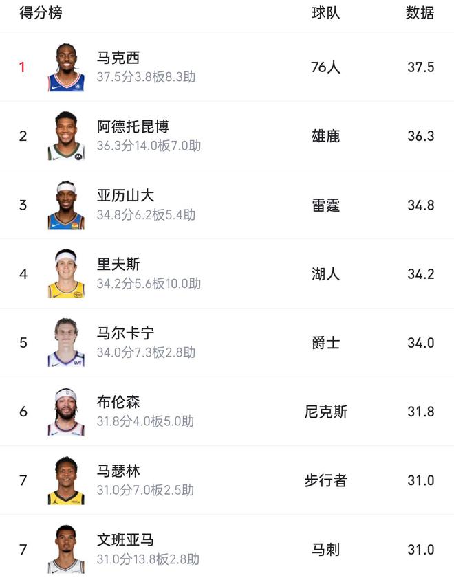 排名第1,场均37.5分说实话,不看结果很难想象,还有谁能在场均得分上力压字母哥和亚历山大,结果真有。他就是76人的马克西,因为乔治受伤、恩比德下滑,马克西不得不扛起球队进攻大旗,过去4场比赛,他场均上场43分钟,得到37.5分3.8篮板8.5助攻,命中率45.5%,场均命中4.5记三分,三分球命中率47.4%,帮助球队4胜0负。马克西这赛季虽然没拿50+,但已经有了2场40+,对于上面的排名,你认为谁最终能拿下本赛季的得分王呢?