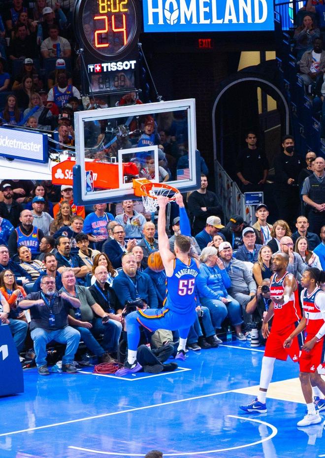 作为全场的助攻王,亚历山大率队实现了5人得分上双。依靠着内外开火,以及防守端的强大威慑力,雷霆得以轻取对手。值得一提的是,亚历山大在此役还创下了纪录。此役之后,亚历山大已经连续78场轰下了20+得分的数据。亚历山大继续排名NBA历史第4的位置,距离第三的大O奥斯卡罗伯特森(79场)只差了1场,历史第一则是张伯伦的126场。如果延续当下的火热状态,双料MVP亚历山大,将很快在该项数据上超越名宿大O。神塔归位雷霆队内线核心之一哈尔滕施泰因,在此战实现了强势归位。哈尔滕施泰因上场26分钟,11投7中,罚球4中3,得到了17分8板5助攻2抢断的全能数据,正负值+15高居全场第二。哈尔滕施泰因以64%的命中率轰下了高分,并且在防守端威慑力十足。哈尔滕施泰因暴扣 哈尔滕施泰因是此战的篮板王,他的5个前场篮板冠绝全场。并且,哈尔滕施泰因抢断次数高居全场第三,他还送出了全队第二多的助攻。在攻防两端和串联球队方面,哈尔滕施泰因都有着强势的发挥,他化身为了禁区擎天柱,堪称实现了神塔归位。