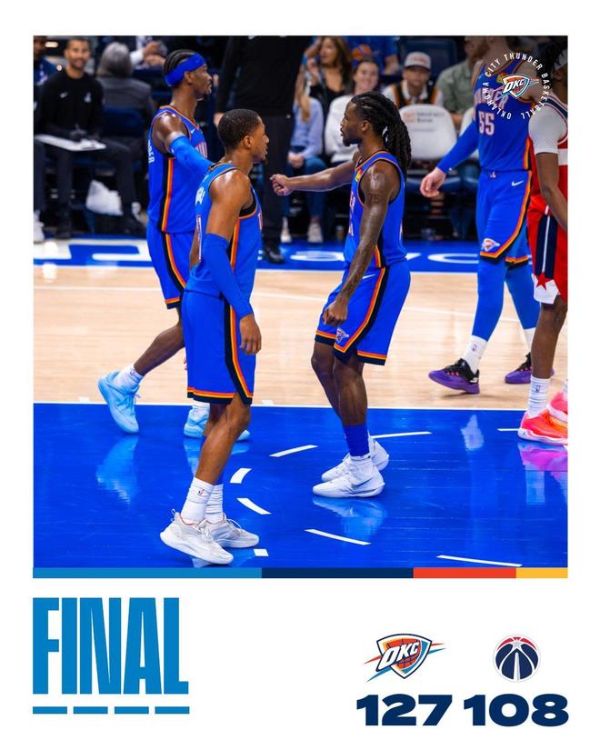 次节较量,奇才依靠着麦科勒姆、萨尔等人的单打,进攻表现有所回升。不过,华盛顿依然无法限制对手的全民皆兵。亚历山大率队继续高举进攻大旗,并且连续抢断得手,得以将分差扩大至两位数。半场打完,奇才以49比59落后。易地再战,场上风云突变。两队开始展开对轰,奇才进攻效率大幅度提升。OKC则在亚历山大、霍姆格伦的带领之下,与之周旋。依靠着个人单打的华盛顿,得以紧咬比分。进入末节之前,雷霆仅仅领先8分。哈尔滕施泰因低位防守 末节决战,哈尔滕施泰因率队实现了全民皆兵,以赛亚乔、米切尔都从替补席发力,雷霆轰出了18比2的进攻狂潮,一举将分差扩大至24分。奇才追分乏力,两队逐渐开始在场上练兵,比赛早早失去了悬念。最终,雷霆以127比108完胜对手。两队数据奇才队,CJ麦科勒姆10中6,三分球8中5高效砍下了19分2板1助、库利巴利12中6得到了16分8板4助3帽、萨尔11中5贡献了14分8板2助2帽、小将乔治得到了12分7板6助,展现了全能身手,但出现了5次失误和5次犯规。特雷-约翰逊10分3板2助、基斯珀特8分6板2助、巴格利8分3板2助、惠特摩尔7分5板1助、米德尔顿6中3得到6分1板2助、卡林顿3分4板1助。雷霆完胜奇才,得以斩获6连胜