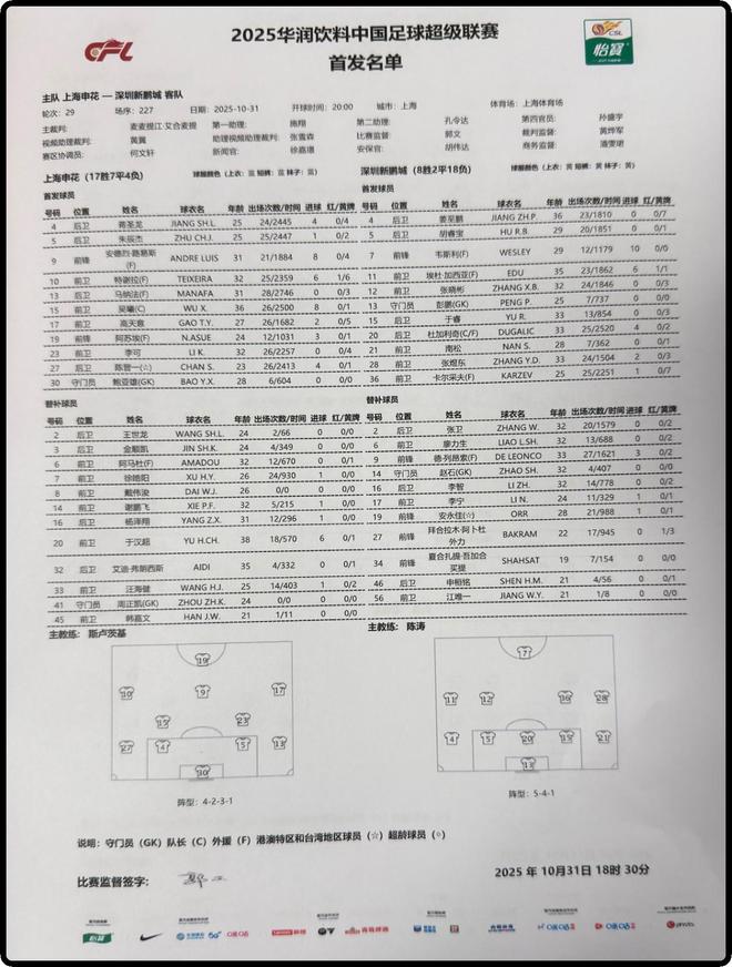 北京时间10月31日20:00,中超联赛第29轮继续进行,排名第3的上海申花主场迎战排名12的深圳新鹏城。本场比赛在上海体育场进行,主裁判是麦麦提江。赛前双方首发阵容公布如下: 双方首发阵容: