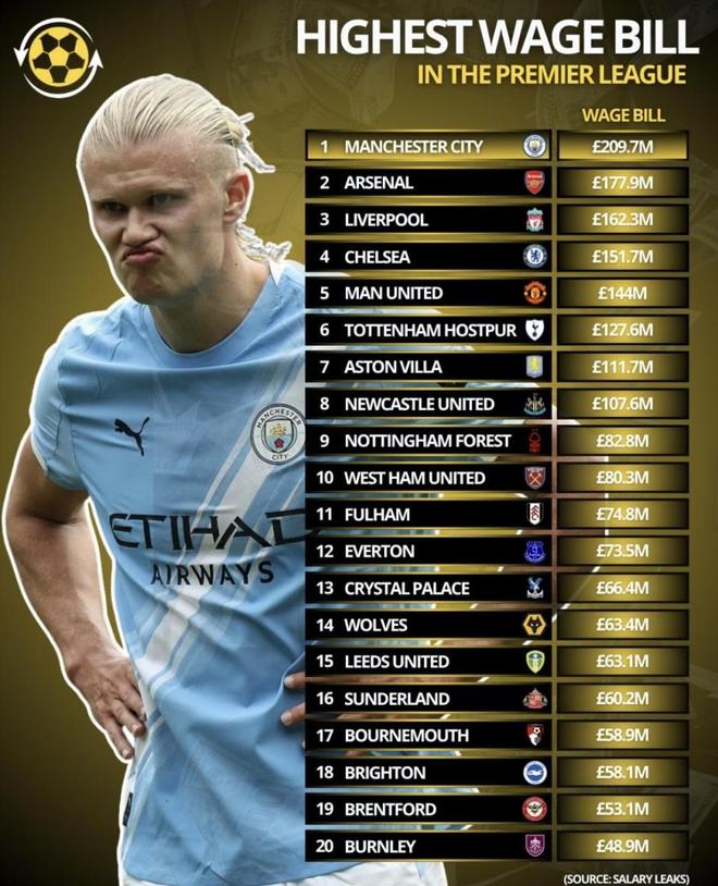 - 英超 | 英超各俱乐部年度工资总额曝光!曼城19亿元利物浦15亿曼联13亿