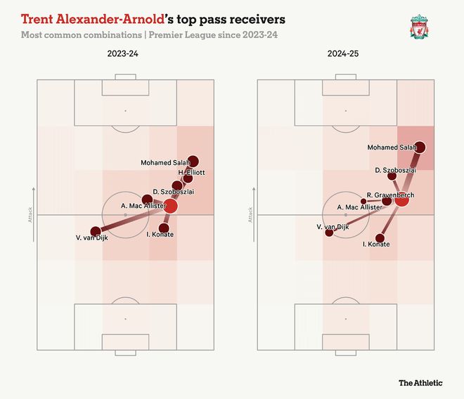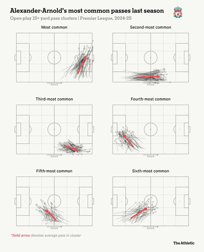 自9月16日受伤以来,阿诺德尚未登场。在皇家马德里的最近两场比赛中,他都被列入替补名单,在卡瓦哈尔因伤缺阵的情况下,看着巴尔韦德顶替他的位置。这次他很可能再次以替补身份出场。阿诺德仍在适应夏季转会后的新环境,这笔交易最终为利物浦带来了1000万欧元的收入,因为皇马希望他能及时加盟参加世俱杯。他正在努力在更衣室中找到自己的声音,并每周花三个小时学习西班牙语以帮助融入球队。有英格兰队友兼足球生涯中的挚友贝林厄姆作为队友无疑有所帮助——尽管本赛季他们尚未同场竞技——但他也与维尼修斯和姆巴佩建立了良好的关系。阿诺德表示,如果他今晚出场,无论受到怎样的接待,他对老东家的感情都不会改变。“我会永远爱这家俱乐部,”。朋友和前队友罗伯逊、萨拉赫和科纳特已经与他联系,但范戴克没有。“不,完全没有私人矛盾,”他在上周被问及是否在阿诺德离队后有过联系时表示。“显然,我过我的生活,他在马德里过他的生活。我很高兴曾经与他并肩作战,但现在他是对手,如果他上场,我们必须让他难以发挥出他的特长。”在对阿诺德离队的愤怒声中,利物浦将失去他的足球才华这一点似乎被忽视了。然而,这一事实毋庸置疑,球队右后卫的位置也最为动荡,布拉德利进进出出阵容,弗林蓬遭遇两次不同的腿筋伤病,而索博斯洛伊则被安排填补空缺,尽管他的强项是踢中场中路。布拉德利在上周末打出了本赛季最佳表现,并完成了90分钟比赛,这对斯洛特来说是一个积极信号。当利物浦上次面对皇家马德里时——上赛季联赛阶段的一场2-0胜利,当时斯洛特甚至无需使用阿诺德——布拉德利对姆巴佩的雷霆铲球令人印象深刻,但更具意义的是他随后遭受的肌肉拉伤,导致他缺席了接下来的五周。如今,他的耐久性对利物浦至关重要,同时还需要与萨拉赫建立曾让阿诺德受益匪浅的良好配合。布拉德利不像他取代的那个人那样富有创造力,但他提供了其他特点,比如切入中路的跑动,而利物浦也不再拥有能够送出如此多撕裂防线传球或精准传中的球员。下图突显了阿诺德上赛季最频繁的长传(超过15码),展示了那些快速传中对禁区内的威胁。