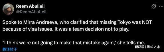 面对WTA年终总决赛前方记者的进一步提问,安德列娃明确表示,缺席东京站并非因为签证问题,而是团队内部共同商定的结果。