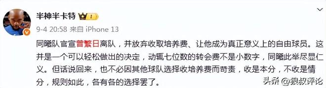 媒体人“半神半卡特”发文点评:这并不是一个可以轻松做出的决定,动辄七位数的转会费不是小数字,同曦此举尽显仁义。但话说回来,也不必因其他球队选择收培养费而苛责,收是本分,不收是情分,规则如此,各有各的选择罢了。