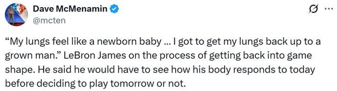 “就像预想的那样,我的肺现在感觉像新生儿的一样——这是最关键的一点。我得让它恢复到成年人的状态。而且我的嗓子已经哑了,才回来一天,就忙着喊战术、布置任务之类的,得让嗓子重新适应。所以今晚得多喝茶、好好休息。”詹姆斯表示,会根据今天身体的反应,来决定明天是否出战。詹姆斯还说恢复到成年人的体能水平,只有通过上场比赛才能实现。