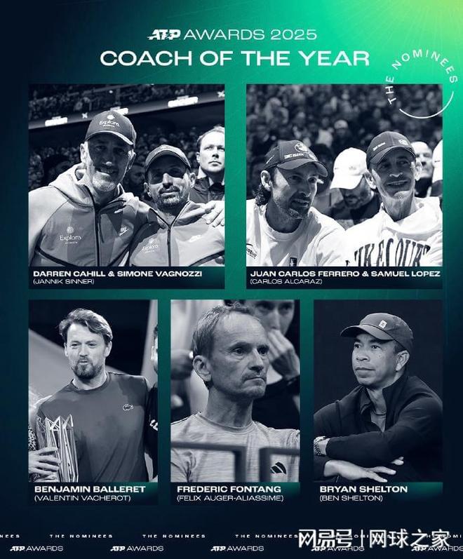 年度最佳教练的提名是卡希尔&瓦格诺兹(辛纳)、费雷罗&塞缪尔-洛佩兹(阿尔卡拉斯)、巴勒雷(瓦舍罗)、冯唐(阿利亚西姆)、布莱恩-谢尔顿(本-谢尔顿)。