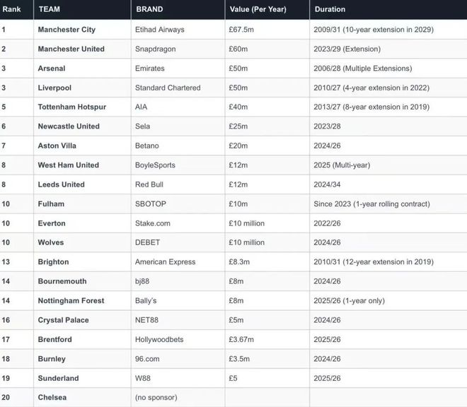 2020-21赛季Three UK成为切尔西胸前赞助商图:切尔西官网随着2021欧冠冠军的红利逐渐消耗殆尽,飘忽不定的国内赛场战绩成为切尔西胸前价值无法实现阶层跃迁的重要因素。失去欧冠资格,球队的市场价值也随着联赛排名一起跌入谷底。尽管2023年切尔西在新赛季开始一个月后成功与美国新锐科技公司Infinite Athlete达成超4000万英镑的合作,但也仅仅合作一个赛季便草草结束。切尔西在2024-25赛季的大部分时间都陷入“裸奔”窘境,直至赛季末迪拜房地产开发商Damac签下短期赞助协议,以700万买下赛季剩余7场比赛的胸前广告位。而在训练场上,切尔西球员胸前也有加密货币公司BingX以1100万英镑价格入局,这一价位在英超已然与富勒姆等中下游球队的胸前广告价位对等。