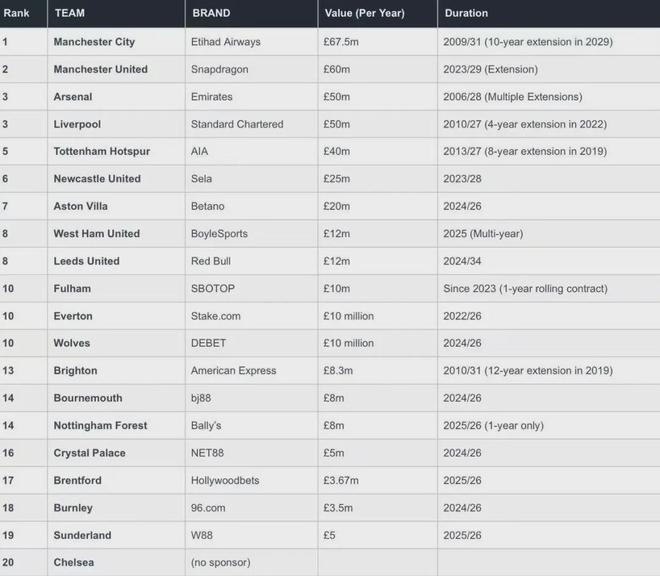 2020-21赛季ThreeUK成为切尔西胸前赞助商图:切尔西官网随着2021欧冠冠军的红利逐渐消耗殆尽,飘忽不定的国内赛场战绩成为切尔西胸前价值无法实现阶层跃迁的重要因素。失去欧冠资格,球队的市场价值也随着联赛排名一起跌入谷底。尽管2023年切尔西在新赛季开始一个月后成功与美国新锐科技公司Infinite Athlete达成超4000万英镑的合作,但也仅仅合作一个赛季便草草结束。切尔西在2024-25赛季的大部分时间都陷入“裸奔”窘境,直至赛季末迪拜房地产开发商Damac签下短期赞助协议,以700万买下赛季剩余7场比赛的胸前广告位。而在训练场上,切尔西球员胸前也有加密货币公司BingX以1100万英镑价格入局,这一价位在英超已然与富勒姆等中下游球队的胸前广告价位对等。