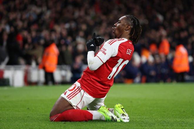 此役,枪手有多名主力缺阵,埃泽联手萨卡、特罗萨德和客串中锋的梅里诺组成了球队的攻击群。开场36分钟,特罗萨德为枪手首开纪录。5分钟后,埃泽潇洒抽射破门打开自己的进球账户。而在下半场,埃泽先是闪击得手扩大比分领先优势,又在对手扳回1球的情况下再度破门,上演了加盟枪手之后的第一个帽子戏法,最终率队4-1大获全胜。此役,埃泽打满全场,6次射门4次射正打进3球,3次成功突破,以上数据都是全场最高。此外,他还有1次关键传球、2次抢断、2次拦截和1次争顶,9次地面对抗赢下7次。赛后,英格兰前锋得到了10分的满分,可谓是实至名归。