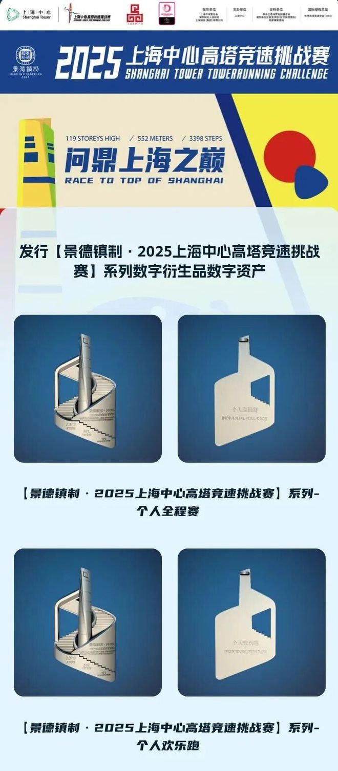 本次赛事还发行了【景德镇制·2025上海中心高塔竞速挑战赛】系列数字资产,包括个人全程赛、个人欢乐跑两款形象,作为参赛选手的特殊数字礼物。