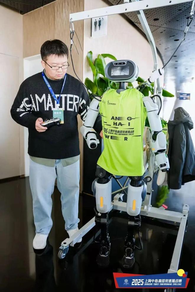 今年,上海中心将科技与赛事相融合,引入了来自傲鲨智能的外骨骼机器人助力神器,通过智能传感与动力辅助,支撑使用者稳步攀登,以科技普惠的方式,在个人欢乐跑中帮助更多的人体验到向上奔跑的乐趣;赛事中还有来自上海市人形机器人创新孵化器的机器人与机器狗为参赛者们加油助威,让科技融入体育,烘托赛事氛围。