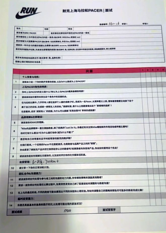 面试前,Pacer要先填写一张有超过14个问题的表格,里面内容涉及到比如“为何想成为上马的Pacer”,“你认为成为上马的pacer需要具备哪些特质”,“分享一下你的日常训练计划”,“是否具备基本的急救和医疗知识,处理可能出现的紧急状况”等等。