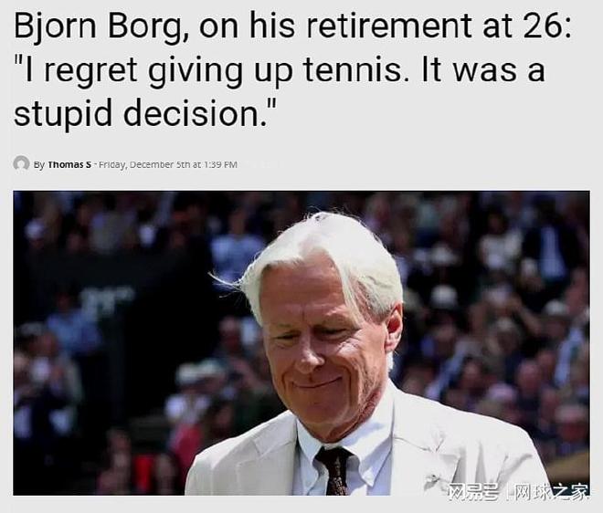 近日,在接受西班牙《马卡报》专访时,博格坦承,自己当年过早选择退役是一个愚蠢的决定,“我当时还不满26岁,但失去了动力。这不是我后悔的地方,因为我需要彻底调整心态才能继续,但我没能做到。我后悔的是就此放弃了网球,这是愚蠢的决定,因为我有很多朋友,我后来一直在想为什么要这么做。我放弃了已有的一切,选择了另一种生活,这是我所后悔的。”