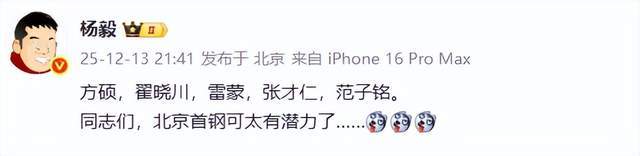 北京时间12月13日消息,2025-26赛季CBA常规赛第一轮全面开打,北京首钢男篮客场以84-74击败江苏男篮,拿到了赛季开门红。随后进行的潜力赛,北京男篮的首发,直接叫人惊呆了,首发5人加起来154岁,说好了锻炼年轻人呢?如此潜力赛,难怪又遭吐槽了,连名嘴杨毅都忍不住了:北京首钢太有潜力了。