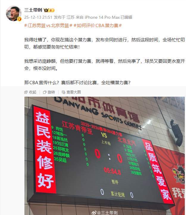 媒体人三土带刺老师更是毫不掩饰了——我得吐槽了,你现在搞这个潜力赛,发布会同时进行,然后这段时间,全场忙忙叨叨,都感觉要匆匆忙忙结束!我想采访庞峥麟,但他要打潜力赛,就得等着,然后完事了,球员又要回更衣室开会,根本没时间。那CBA宣传什么?赛后都不讨论比赛,全吐槽潜力赛?
