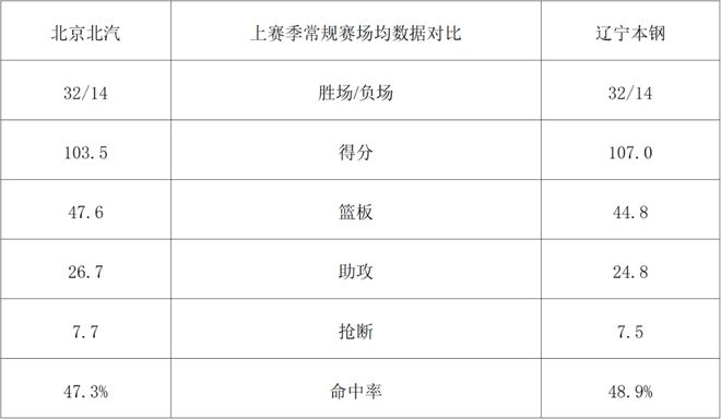 主要球员上赛季常规赛数据:北京北汽:杰曼:上赛季常规赛出战46场,场均上场28.7分钟,得到17.4分、4.4个篮板、6.8次助攻和1.3次抢断。周琦:上赛季常规赛出战26场,场均上场27.4分钟,得到14.8分、8.3个篮板、6.8次助攻和1.8次盖帽。陈盈骏:上赛季常规赛出战33场,场均上场29.8分钟,得到12.7分、2.8个篮板、5.6次助攻和1.5次抢断。辽宁本钢:威尔斯:上赛季常规赛出战36场,场均上场32.7分钟,得到21.3分、3.7个篮板、4.0次助攻。姜宇星:上赛季常规赛出战7场,场均上场35.3分钟,得到12.7分、3.7个篮板、2.0次助攻、1.1次抢断。付豪:上赛季常规赛出战45场,场均上场25.8分钟,得到11.1分、5.3个篮板、1.3次助攻。里程碑数据:北京北汽:周琦CBA生涯篮板总计为2903个,位列CBA历史篮板榜第27位,距离第27位的朱芳雨(2939个)还差36个。翟晓川CBA生涯得分总计为6645分,位列CBA历史得分榜第34位,距离第33位的贾马尔·富兰克林(6649分)还差4分。方硕CBA生涯三分命中数总计为706个,位列CBA历史三分榜第42位,距离第41位的罗智(708个)还差2个。翟晓川CBA生涯抢断总计为561次,位列CBA历史抢断榜第44位,距离第43位的王治郅(565次)还差4次。范子铭CBA生涯盖帽总计为244次,位列CBA历史盖帽榜第47位,距离第46位的迈克·哈里斯(247次)还差3次。赵睿CBA生涯抢断总计为546次,位列CBA历史抢断榜第49位,距离第48位的边强(547次)还差1次。辽宁本钢:埃里克·莫兰德CBA生涯盖帽总计为376次,位列CBA历史盖帽榜第26位,距离第25位的兰多夫·莫里斯(378次)还差2次。李晓旭CBA生涯抢断总计为639次,位列CBA历史抢断榜第28位,距离第27位的杨鸣(644次)还差5次。李晓旭CBA生涯总得分总计为6486分,位列CBA历史得分榜第38位,距离第37位的孟达(6527分)还差41分。付豪CBA生涯篮板总计为2562个,位列CBA历史篮板榜第38位,距离第37位的周鹏(2579个)还差17个。以上内容请关注首页JRS