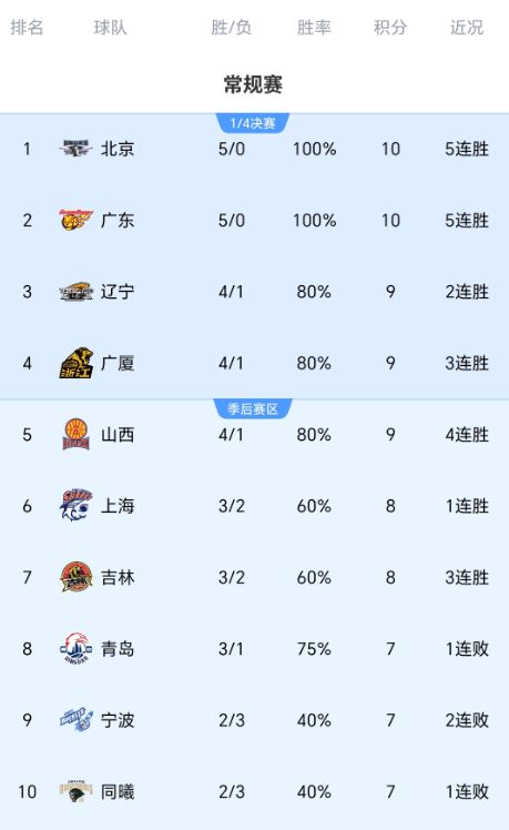 从以上积分榜来看,北京队、广东队继续保持全胜,辽宁队、广厦队都是4胜1负,分列第三、第四,另外全败的球队仅剩天津队、四川队,江苏队已经拿到了首场胜利。作为昔日的总冠军,四川队本轮比赛遭遇51分的惨败,继续沦为垫底位置。以上内容请关注首页JRS