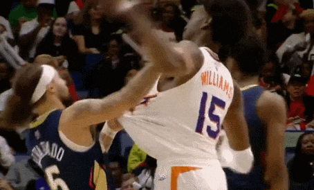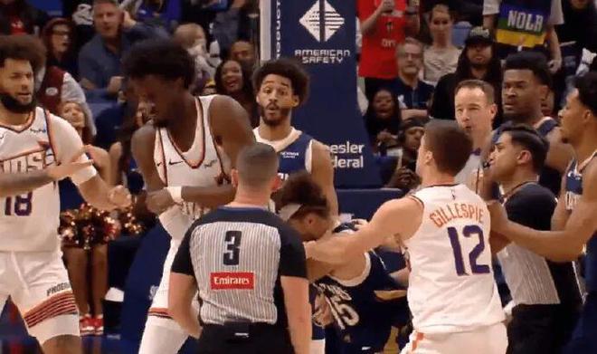 最近结束的太阳123-114鹈鹕比赛,第三节阿尔瓦拉多和马威发生激烈冲突,两人挥拳相向,硬生生将篮球场变成UFC赛场。