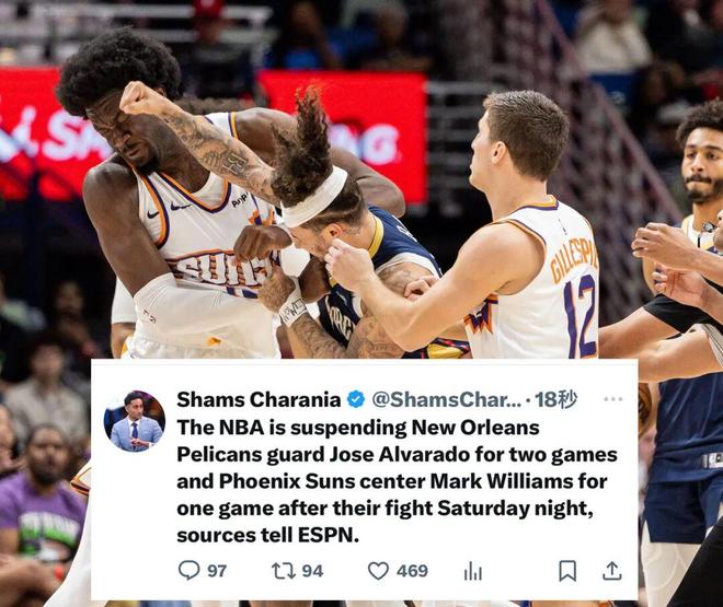 NBA官方宣布:鹈鹕的阿尔瓦拉多被禁赛两场(损失约6.2万美元),马威则被禁赛一场(损失约3.6万美元)。