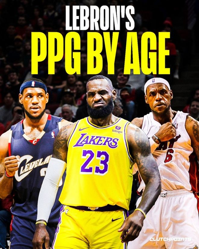 有媒体BronMuse统计并公布了詹姆斯从出道的18岁到41岁生日前的40岁,每个年龄段的最高得分。其中18岁最低,只有37分,当时詹姆斯才出道。40岁还有42分。最高是29岁,61分。第二低反而在巅峰期,大概因为不需要发力,34岁、39分。其他都是40分、50分这个区间。CLUTCHPOINTS统计的是每个年龄段的场均得分,18岁是20.2分,最低,21岁最高,30.2分,37岁是30.1分,40岁是24分,其他是25、26、27、28、29分。