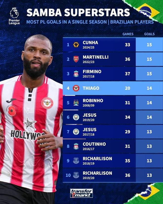 - 英超 | 20场14球,伊戈尔蒂亚戈有望创造巴西球员英超单赛季进球纪录