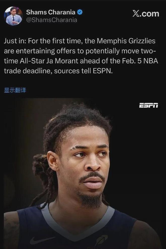 爆料王Shams:灰熊考虑送走莫兰特,首次将在本赛季交易截止日(2月6日)前听取他的报价。