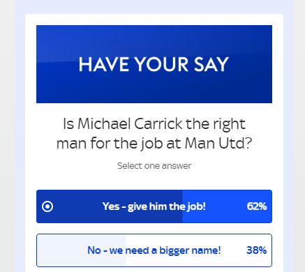 《天空体育》随即进行了调查,62%的球迷认为卡里克是执教曼联的合适人选,38%的球迷认为曼联需要名气更大的主帅。